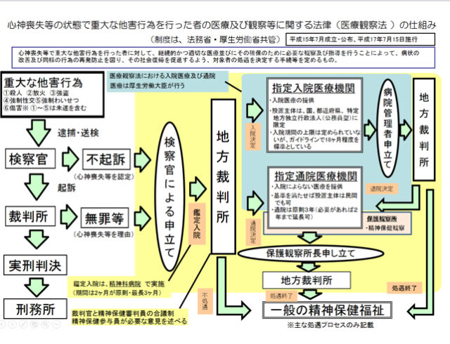 2001年、宅間守元死刑囚(執行済)が大阪教育大学附属池田小学校で死者8人、負傷者15人を出した痛ましい事件で世論、立法府が転換点を迎えてこの法律が成立したものです。宅間守が過去に措置入院歴があったこともこの法制定に関係があったでしょう。