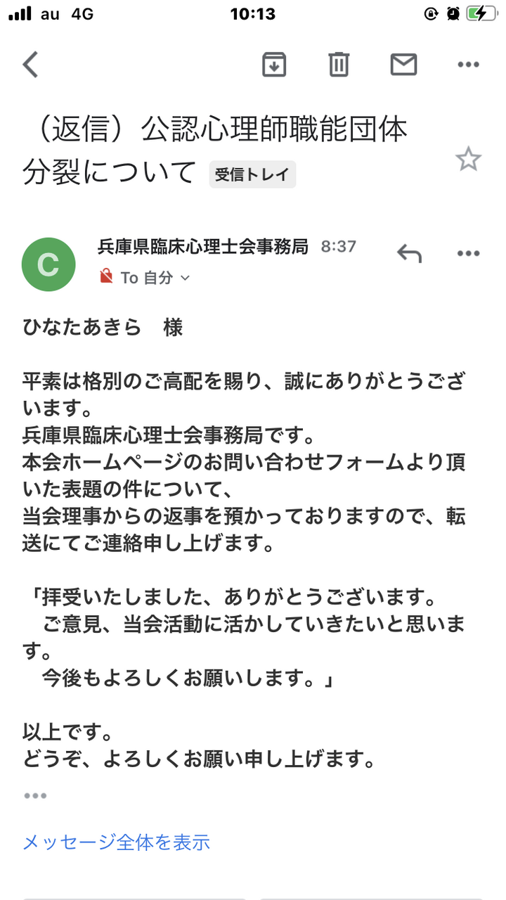 地方各心理団体にも問題提起を行うことで職能団体分裂のデメリットについての認識を深めて欲しい、このブログはとても小さな力しか持たないものですが、大海に一石でも投じることができればいい、草の根でもこれが大きな事だと思って欲しいという思いから質問メールを出したものです。